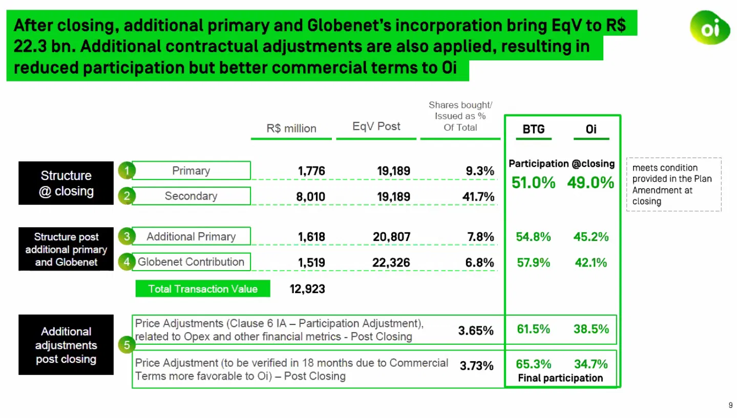Com a aplicação desse mecanismo, a participação da Oi foi reduzida para 34,7%, enquanto a da V.tal aumentou para 65,3%.